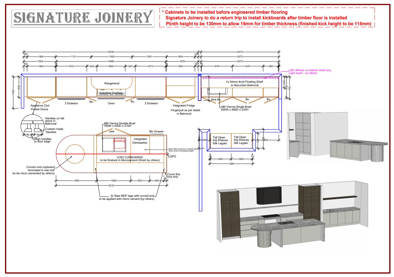 At Signature Joinery, we take immense pride in the expertise and professionalism of our dedicated team. Our office is made up of skilled administrative staff and talented design drafters who specialise in creating innovative designs using cutting-edge CAD software. This advanced technology allows us to produce precise and detailed plans that are integral to our process. Once these designs are finalised, they are transmitted to our state-of-the-art factory, where our robotic machinery expertly and accurately cuts each component, enabling us to achieve efficient mass production without compromising quality.
